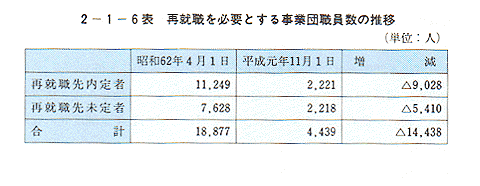 この結果、公的部門等に採用内定している事業団職員の採用が着実に進む一方、事業団移行時の62年4月1日には、7,628人であった再就職先未定の職員も平成元年11月1日現在で2,218人まで減少した。