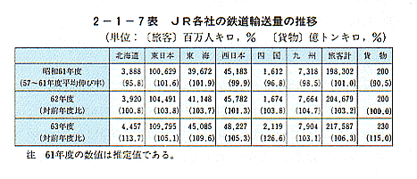 このような輸送量の増加は、国内の好景気並びに青函トンネル及び瀬戸大橋の開通に伴う誘発的効果によるところもあるが、津軽海峡線及び本四備讃線の開業に合わせたダイヤ改正による列車の増発、運転区間の拡大、スピードアップ、接続改善等地域に密着した輸送サービスの提供、新製車両の投入、駅施設の改良等によるサービスの向上、貨物輸送におけるクールコンテナ輸送の実施等利用者のニーズに合った輸送方式の充実等国鉄改革の趣旨に沿った営業努力及び経営の活性化が図られたことも大きく寄与しているものと考えられる。