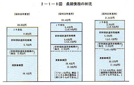 - 以上みてきたように、国鉄改革の推進状況は、JR各社の輸送量及び各法人の収支の状況の面ではおおむね順調であり、この点では国鉄改革は順調に進んでいるものと考えられる。しかし、国鉄改革のより一層の推進・定着化のためには、国鉄長期債務等の処理をはじめとした課題に今後とも引き続き取り組んでいく必要がある。