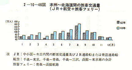 、特に63年9月までは、トンネル開通直後のブームと青函博覧会の開催(63年7月9日〜9月18日)とも相まってJR旅客(青函博覧会に際して運航されたJR船舶の実績を含む。)に毎月前年同月に比べ10万人前後の増加をもたらすとともに、JR旅客と競合すると思われたフェリーについても波及的効果を生じさせ、大幅な増加となった。 各交通機関別の特徴は次のとおりである