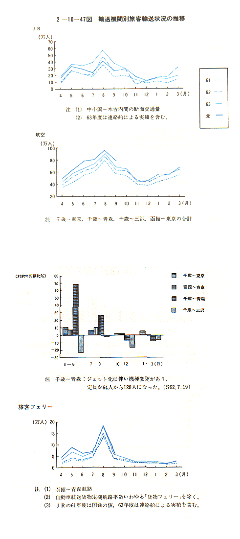 しかし、路線別にみると千歳〜三沢便は青森空港のジェット化もあって11.4%減と大幅に減少、千歳〜青森便も63年度下期はいわゆる青函連絡船フィーバーの反動減もあって対前年同期比7.1%減となっているが、これは短距離路線において青函トンネル開通の影響が現れているためとも考えられる。