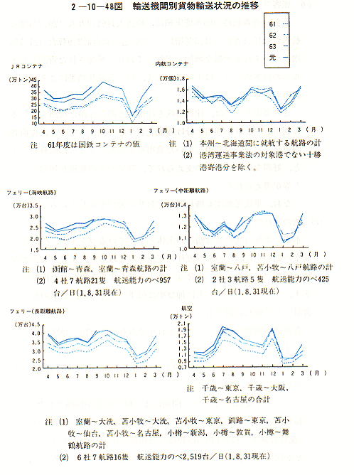航路別にみると、海峡航路(函館〜青森、室蘭〜青森航路の計)は2.8%増(62年度10.5%増)、中距離航路(室蘭〜八戸、苫小牧〜八戸航路の計)は0.5%増(同1.4%増)、長距離航路(室蘭〜大洗、苫小牧〜大洗、苫小牧〜東京、釧路〜東京、苫小牧〜仙台、苫小牧〜名古屋、小樽〜新潟、小樽〜敦賀、小樽〜舞鶴航路の計)は8.1%増(同11.0%増)であった。これをみると、トンネル開通の影響は主として海峡航路に現れている。