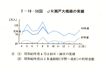 なお、昭和63年9月以降は、20〜30万台/月と低迷していたが平成元年度になってからもこの傾向は改善されず、わずかに5月のみが30万台を上回っている。このように瀬戸大橋の利用が振るわないのは通行料金(普通車174円/km、早島〜坂出インター間)が他の高速道路(同23円/km)に比べ割高なこと、瀬戸大橋に結ぶ両端の高速道路が本州側の西行きを除き未整備なこと等によるものと考えられる。