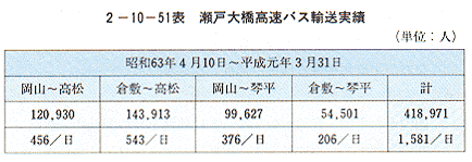香川県と岡山県を直結する高速バスは、5社により4系統22往復(平成元年3月19日より27往復)が運行されており、瀬戸大橋開通から元年3月末日までの輸送実績
