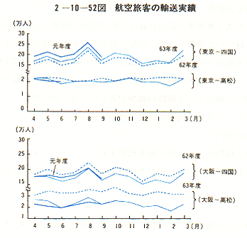 四国内の4空港と東京、大阪を結ぶ航空路線の昭和63年度の輸送実績は、約429万人(1.0%減)であった。
