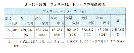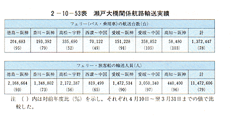瀬戸大橋開通により同大橋を利用するトラック、JRコンテナはいずれも好調であったが、瀬戸大橋直下航路のフェリーは大きな影響を受けた。