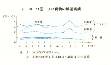 コンテナ輸送については、コンテナ列車2本を4月から3本に増設して輸送力を増強したことや、大幅なダイヤ改正により所要時間が短縮されたこともあって、瀬戸大橋開通から元年3月末日までの四国発のコンテナ輸送トン数は、約37万トン(55.8%増)と大きな伸びを示し、また、車扱貨物についても約11万トン(12.0%増)と全国的に車扱が不振を示しているなかで大きな伸びとなっており、瀬戸大橋線開業の効果が現れているものと考えられる。