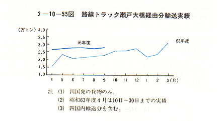瀬戸大橋経由の四国から本州向け路線トラック16社の、瀬戸大橋開通から元年3月末日までの輸送トン数は、約28万トンとなっており、当初予定数量(1ヶ月3万トン弱)の78%程度であったが、3月になって初めて当初予定数量を上回った