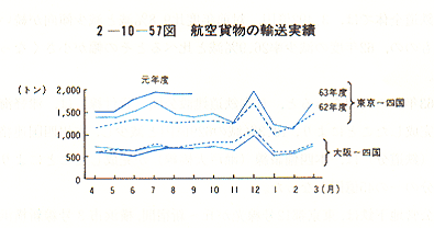 四国内の4空港と東京、大阪を結ぶ航空路線の63年度の貨物輸送実績は、約1.8万トン(7.9%増)であった。