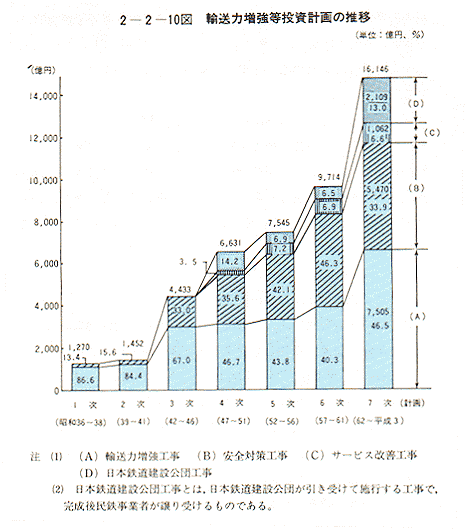 第6次計画までの総投資額は3兆1,045億円となっており、現在推進している第7次計画(昭和62〜平成3年度)においては、総額1兆6,146億円の投資を予定している。第7次計画により、複々線化、車両の増備、運転保安の充実、エスカレーターの設置等を積極的に推進し、平成3年度には、ラッシュ時の混雑率は昭和61年度末の184%から180%に、車両の冷房化率は同85.7%から96.9%になる予定である。