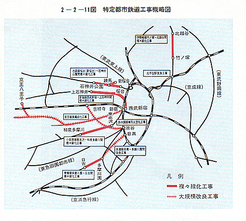 また、複々線化等の抜本的な輸送力増強を図るため、昭和62年12月には、特定都市鉄道整備促進特別措置法に基づき、東武鉄道等5社の特定都市鉄道整備事業計画を認定し、63年5月にはこの計画を実施するための積立金分を含めた運賃改定を認可した。現在、積立金制度の活用による大規模な輸送力増強工事が進められているところである。〔2−2−10図〕〔2−2−11図〕。