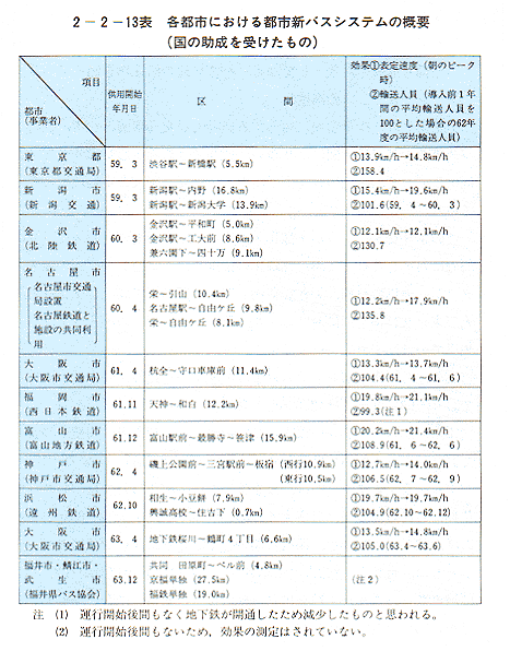 このシステムは、58年度から、東京都、新潟市、金沢市、名古屋市、大阪市、福岡市、富山市、神戸市、浜松市、福井市、鯖江市及び武生市の12都市において導入されている。地域によって程度の差はあるものの、おおむね表定速度、輸送人員が増加しており、都市新バスシステムは、確実にその効果を上げつつあるといえる〔2−2−13表〕。