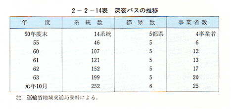 元年10月現在、このような深夜バス(深夜急行バスを含む。)は、東京都、神奈川県、千葉県、埼玉県、愛知県及び岐阜県の6都県において252系統が運行されている〔2−2−14表〕。