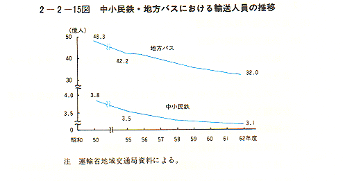 - 中小民鉄及び地方バスは、地域における生活基盤として必要不可欠なものである。しかしながら、輸送人員が62年度において、中小民鉄約3.1億人(対前年度比0.9%減)、地方バス(三大都市圏を除く。)約32億人(同3.0%減)と減少し