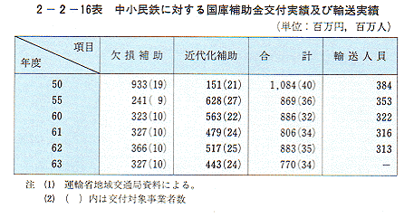 - 中小民鉄は、経営改善を図りその維持に努めているものの、大部分の事業者が赤字経営となっているが、地方交通に重要な役割を果たしている。このため、国としても、地方公共団体と協力して、その運輸が継続されないと国民生活に著しい障害が生じるものについて、経常損失額に対し補助(欠損補助)を行うとともに、設備の近代化を推進することにより経営改善、保安度の向上又はサービスの改善効果が著しいと認められるものに対し、設備整備費の一部を補助(近代化補助)している。