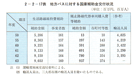 なお、63年度においては、乗合バス事業者160社、374市町村等に対し、約99.7億円の国庫補助金を交付した〔2−2−17表〕。