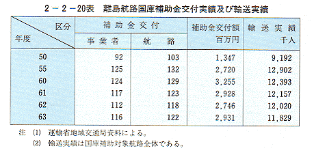 - 我が国には有人島が420あまりあり、離島航路は、住民の不可欠な生活の足として重要な役割を果たしている。離島航路は、陸の孤島と呼ばれる僻地に通う準離島航路を含めて、平成元年4月現在372航路あるが、これら離島航路の多くは、輸送需要の低迷、諸経費の上昇等により赤字経営を余儀なくされている。