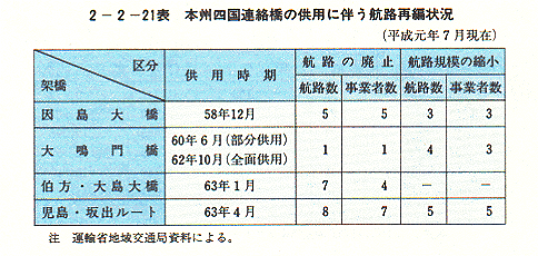 - 本州四国連絡橋の建設に伴い、関連地域の交通輸送に重要な役割を果たしている一般旅客定期航路事業は、相当の影響を受けるものと予想されるところから、その影響を軽減するため、「本州四国連絡橋の建設に伴う一般旅客定期航路事業等に関する特別措置法」(昭和56年法律第72号)に基づき、一般旅客定期航路事業の再編成、当該事業を営む者に対する助成及び離職を余儀なくされる者の再就職の促進等の措置が講じられることになっている。