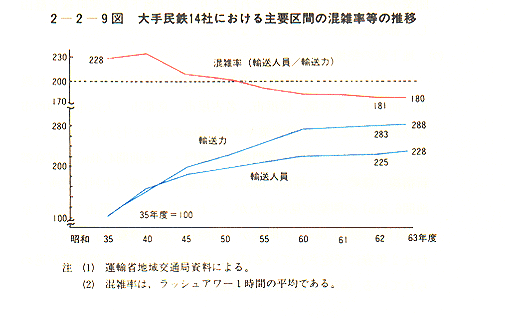 - 大手民鉄14社は、昭和36年度以降7次にわたる輸送力増強等投資計画を推進し、混雑緩和、輸送サービスの向上などに努めている。その結果、昭和63年度までに新線建設183.8km、複々線化36.8km等の整備を達成するなど輸送力は着実に整備され、混雑率も年々低下してきている〔2−2−9図〕。