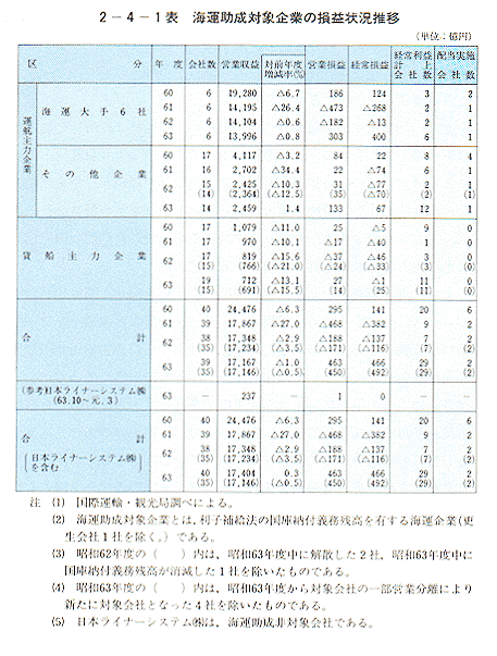 昭和63年度の海運助成対象企業39社の損益状況は、〔2−4−1表〕のとおりであり、海運大手6社が営業損益ベースで182億円の損失から303億円の利益に転じたのをはじめ、39社中29社が経常利益を計上するなど、営業損益ベース、経常損益ベースともに3年ぶりに黒字転換し、長期化した海運不況もようやく底を打った内容となっている。