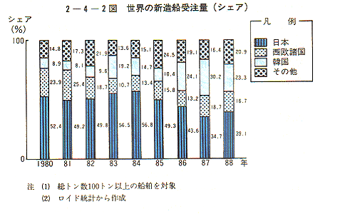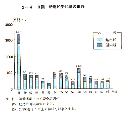 - 我が国造船業は、第2次石油危機等に起因する海上輸送構造の変化、産業構造の変化等による世界的な新造船建造需要の減退、プラザ合意以降の円相場の大幅な上昇等により深刻な不況に直面した。これに対処するため、我が国造船業は、大幅な人員合理化を行う一方、昭和62年度に約24%の過剰設備の処理、集約化等の構造対策を実施し、環境変化に対応した体制の整備を進めてきた。また、西欧や韓国の造船業についても、需要環境が悪化する中で、不採算造船所の閉鎖、人員合理化等を実施し、大幅に供給力を減少させてきている。このような世界的規模の造船能力の削減、最近の世界的な景気の拡大を背景とする船腹需給の改善等によって、長期低落傾向にあった受注船価(円ベース)は、昨年初めを底に上昇に転じており、また、受注量に関しても、船価先高感とも相まって顕著な回復を示している。