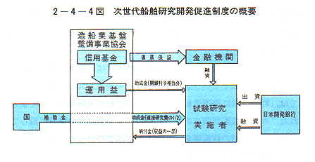 造船業の活性化、海上輸送の高度化を図るため、次世代を担う船舶の研究開発促進制度を創設することとし、特定船舶製造業安定事業協会を造船業基盤整備事業協会に改組し、同協会の業務に助成金の交付、債務保証等の助成業務を追加すること等を内容とする「特定船舶製造業安定事業協会法の一部を改正する法律案」を第114回国会に提出した。同法案は、同国会において成立し、平成元年7月20日施行された。さらに、これらの研究開発に対し、日本開発銀行からの出融資を併せて行うこととした〔2−4−4図〕。