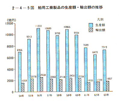 昭和63年には、国内造船需要の回復及び輸出の伸びに支えられ、生産額は7,319億円と前年に比べ13%の増加を示す〔2−4−5図〕など明るい兆しが見え始め、舶用大型ディーゼル機関製造業についても、最近の需要の回復傾向に伴い62年度から実施してきた不況カルテルを平成元年9月末をもって廃止した。しかし、生産水準が低いことには変わりなく、需給ギャップに起因する過当競争により価格が低落したままの製品もあり、依然として舶用工業を取り巻く環境は厳しい状況にある。