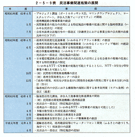 - 国際化や情報化の進展、価値観やライフスタイルの変化などに伴い、港湾の機能に対する要請も高度化、多様化してきている。これらの要請に的確に応えていくためには、従来からの港湾整備事業や港湾関係起債事業による岸壁や道路の整備、土地の造成等の基盤施設の整備に加えて、総合的な開発整備のマスタープランのもとに、民間の資金力、経営力、技術力等の導入を図る必要がある。このため、昭和61年度以来、開発整備の拠点となる民間の施設整備に対し、税制、財政上の支援、規制緩和等の措置を講じている。これらを年表の形でまとめると、〔2−5−9表〕のとおりである。