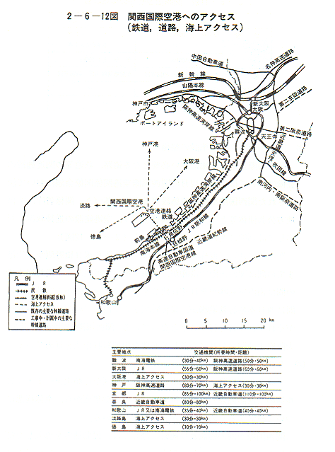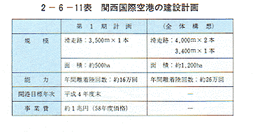 - 関西国際空港は、大阪湾南東部の泉州沖の海上(陸岸からの距離約5kmの沖合)に設置される我が国初の本格的な24時間運用可能な国際空港であり、将来の全体構想を踏まえて段階的に整備を図ることとし、第1期計画の建設を進めている〔2−6−11表〕。