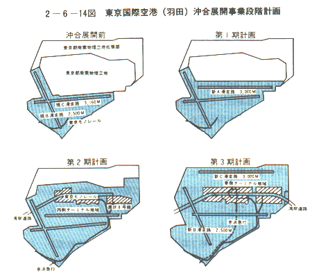 さらにその後には、21世紀の航空需要に対応しうる滑走路処理能力を確保するとともに騒音問題の解決を図るため、2本の滑走路の沖合移転及び東側ターミナルの整備等を第3期として行い、沖合展開事業を完了する予定である〔2−6−14図〕。