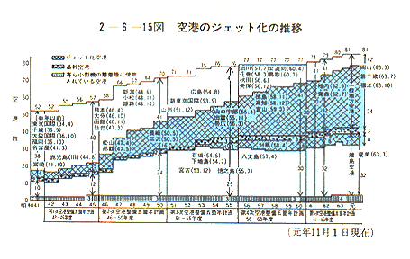 航空輸送は昭和40年代以降急激な伸びを示し、今や国民の足として定着してきており、今後とも、高速輸送の主要な担い手として着実に伸びていくものと考えられる。このため、空港整備については昭和42年度の第1次から現在の第5次に至る空港整備五箇年計画に基づき着実に実施してきており、昭和42年においては空港数52、うちジェット化空港は全空港の12%に当たる6空港、2,500m以上の滑走路を有する大型ジェット機の就航可能な空港は全空港の4%に当たる2空港であったものが、現在空港数81、うちジェット化空港は56%に当たる45空港、大型ジェット機の就航可能な空港は22%に当たる18空港となっている〔2−6−15図〕。その結果、輸送構造を見ると国内航空の166の航空路線のうち65%に当たる107路線がジェット化され、ジェット機就航路線の旅客数は全旅客数の93%に当たる4,931万人を占めるまでに至っており(平成元年4月現在)、また、航空輸送需要は東京・大阪両基幹空港への二極集中構造となっている。