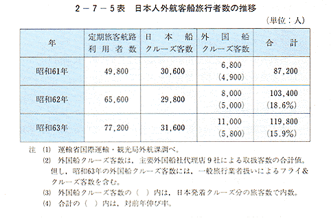 一方、外航クルーズにおいては、外国籍クルーズ客船に乗船した日本人の数は、ここ2〜3年、15%程度の安定した伸びを示しているが、日本籍クルーズ客船に乗船した日本人の数の伸びはやや低調である。このことには、不定期旅客航路で運航している日本籍船舶の隻数に変化がなく、供給面に限界があったことも要因であったと考えられ、平成元年4月に「おせあにっく ぐれいす」(5,218総トン、120人乗り)、日本開発銀行の融資を受けて建造された「ふじ丸」(23,340総トン、600人乗り)が就航したのをはじめとして、邦船社が外航客船の建造計画を相次いで発表していることから、新造船による需要喚起効果が大いに期待されており、我が国にもようやく客船時代が到来し、今後旅客数の大幅な増加が期待される状況となりつつある。
