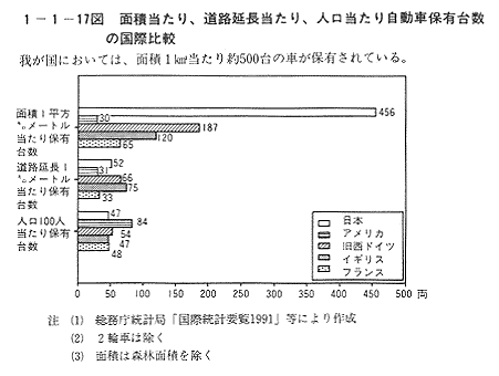 面積当たり、道路延長当たり、人口当たり自動車保有台数の国際比較