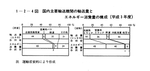 国内主要輸送機関の輸送量とエネルギー消費量の構成(平成3年度)