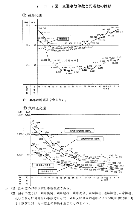 交通事故数と死者数の推移 @道路交通 A鉄軌道交通