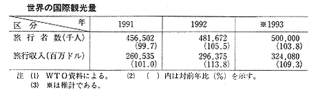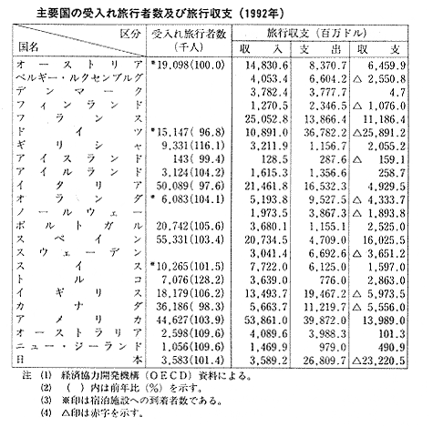 主要国の受入れ旅行者数及び旅行収支(1992年)