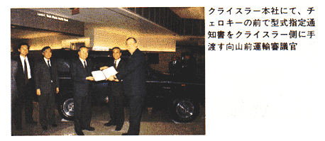 クライスラー本社にて、チェロキーの前で型式指定通知書をクライスラー側に手渡す向山前運輸審議官
