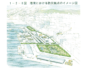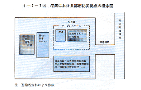 阪神・淡路大震災による港湾被害の甚大さにかんがみ、前述の 「地震に強い港湾のあり方に関する検討調査委員会」 により、個々の港湾施設の耐震性だけではなく、港湾全体としての地震への対応のあり方に関しても、大規模な震災時にも地域経済活動等を維持できる港湾の整備、港湾全体のシステムとしての防災性の向上など、幅広く「地震に強い港湾」の整備について検討が行われた。運輸省では、これを踏まえ、重要港湾等において、震災時に防火等の機能を合わせ持つように植栽等の選定・配置に配慮した避難地としての緑地(避難緑地)を整備していくこととし、さらに概ね拠点港においては、避難緑地等から構成される多目的に利用可能なオープンスぺース、これに隣接若しくは近接する耐震強化岸壁及び背後地域との輸送ルートを確保するとともに、併せて緊急物資の保管施設、通信施設等を必要に応じて備えた防災拠点を整備していくこととしている〔1−2−8図〕。