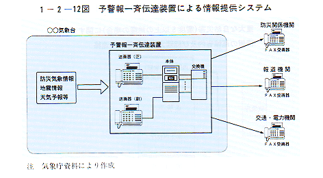 - 震災対策を講ずるうえで、発生した地震の震源地、震度、余震の有無、あるいは津波についての予警報などの情報を迅速に国民や関係行政機関等に伝達・連絡することの重要性は今回の震災においても強く認識された。気象庁では、観測、予報・警報等の発表のため常時1日24時間の勤務体制をとっており、大きな地震が発生した場合においては、職員の非常参集を行い、迅速かつ正確な情報の連絡を行える体制をとっている。また、マスメディアに協力を求めて、入手した情報を直ちに発表するとともに、全国の気象官署から予警報一斉伝達装置〔1−2−12図〕を通じて国や地方公共団体等の防災関係機関に提供しているが、今回の震災を踏まえ、震度5以上の地震、津波警報などの重大な災害情報について、官邸等に直接速報を行えるよう連絡体制の強化を図った〔1−2−13図〕。