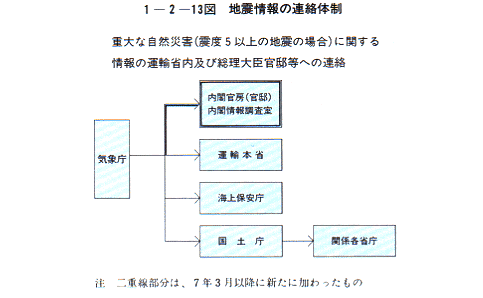 さらに、今回の震災において、政府内における円滑な意思疎通と省庁間にまたがる防災体制の有機的連携を図ることの重要性が認識されたことにかんがみ、今後、大地震の発生に際して、海上保安庁及び気象庁の幹部は、その他の震災に関係の深い省庁等の幹部とともに緊急に官邸に参集し、内閣としての初動措置を始動するため、情報の集約を行うこととしている。