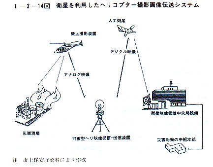 加えて、今回の震災では、画像による被災現場の情報の伝達が、被害状況を的確に把握し、救援活動や二次災害の防止策を実施する上で有効であることが認識された。そのため、海上保安庁では、災害現場の状況を官邸等に早期に伝達し、適切な対応が行えるよう 7年度第1次補正予算により衛星を利用したヘリコプター撮影画像伝送システムの整備を行うこととしている〔1−2−14図〕。