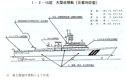 大規模な災害においては、数多くの負傷者や住居を失った被災者が発生することにかんがみ、海上保安庁においては被災者救援のための物資の保管や提供、応急医療の実施や宿泊を可能とする設備を有し、また、災害に的確に対応するための情報処理、指揮機能や災害対策本部設営機能等を備えた大型巡視船(災害対応型)を1隻配備(9年度)するとともに〔1−2−15図〕、消防機能、物資輸送機能を強化し、夜間や水中における調査や捜索を可能とする赤外線捜索監視装置や海中捜索装置等を備えた大型巡視艇を6隻配備(7年度)し、さらに救援物資の輸送、被災状況の調査等の体制の強化にも資する大型巡視艇1隻(8年度)、小型巡視艇等16隻(7年度〜8年度)を配備する。