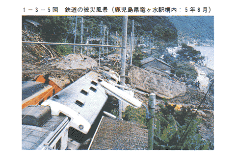 - 鉄道においては、軌道、橋りょう、架線等の施設について鉄道運転規則等に基づく定期点検を実施しており、的確な危険箇所の早期把握に努めている。特に、梅雨期や台風時期においては、豪雨や暴風による土砂崩れやレール上の障害物の発生などがおこるおそれのある海岸沿いや崖の側面など〔1−3−5図〕の点検を強化している。