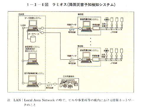 また、集中豪雨などによる鉄道の盛土部分の崩壊は、列車の走行安全性について重大な悪影響を与える。このため、鉄道総合技術研究所において鉄道沿線の降雨量により鉄道盛土が崩壊する危険性を測定・評価し、運転規制等の警報発令を発するラミオス(降雨災害予知検知システム)の開発が進められている〔1−3−6図〕。
