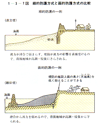 なお、近年、護岸、海浜、離岸堤等の海岸保全施設を面的な広がりを持たせて適切に配置し、それらの複合機能により背後地域を高潮、侵食等の災害から防護する面的防護方式が注目されている〔1−3−7図〕。これは波浪等の外力を堤防や護岸のみで防護するのではなく、波力を沖合から徐々に弱めていく方式であり、海からの脅威に対し厚みをもって機能する粘り強い構造となっている。この方式は、施設の耐久性を向上させるほか、堤防等の施設上面の高さ(天端高:てんぱだか)を抑えることが可能となることから、景観的にも優れ、良好な海岸空間を形成することにもつながるので、今後積極的に活用していくこととしている。