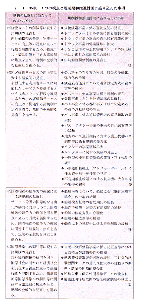 - 規制緩和推進計画は、我が国の経済社会構造の変革を進めるために重要な施策である規制緩和を計画的に推進するに当たって、今後数年間、行政指針となるものであるとの認識の下に、2で述べた内外の意見・要望を踏まえ規制緩和事項の検討を行うとともに、主に(ア)物流コストの削減等に資する諸規制の見直し、(イ)旅客輸送サ−ビスの向上等に資する諸規制の見直し、(ウ)国際輸送の競争力の確保に資する諸規制の見直し、(エ)国際基準への調和等に資する諸規制の見直し、の4つの視点に立って規制の全般的な見直しを行い、規制緩和推進計画の策定に積極的に取り組んだ。具体的には〔2−1−35表〕のとおりである。