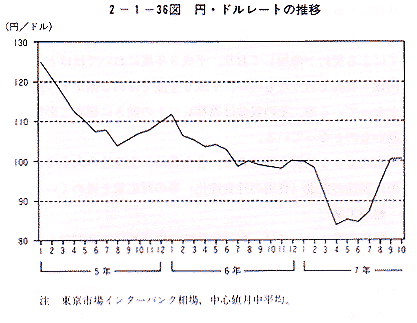 - 我が国経済については、平成5年第4四半期にバブル崩壊後の景気の後退局面から脱したものの、平成7年3月以降の急激な円高等の影響もあって、景気は足踏み状態が長引くなかで、弱含みで推移している。