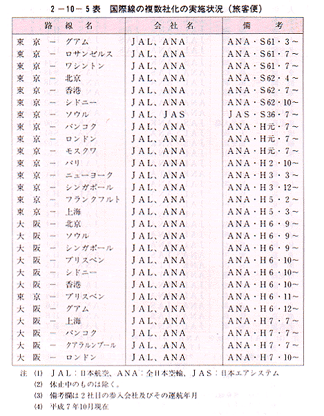 。また、同審議会の答申に沿って、6年10月に大阪−ブリスベン線、大阪−シドニー線及び大阪−香港線、6年11月には東京−ブリスベン線、6年12月には大阪−グアム線、7年7月に大阪−上海線、大阪−バンコク線、大阪−クアラルンプール線、7年10月に大阪−ロンドン線が複数社化され、国際線の複数社化路線は27路線となった