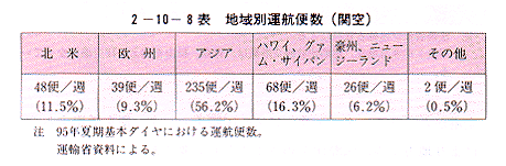 我が国の国内航空路線網については、6年8月から7年8月までの1年間で187路線から216路線、総便数では702便から778便に増えたが、それぞれの増加分の約7割は、関西国際空港開港によるものとなっている。