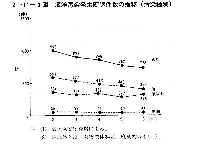 6年に我が国周辺海域において海上保安庁が確認した海洋汚染の発生件数は、732件であり、5年より30件(約4%)減少した〔2−11−3図〕。